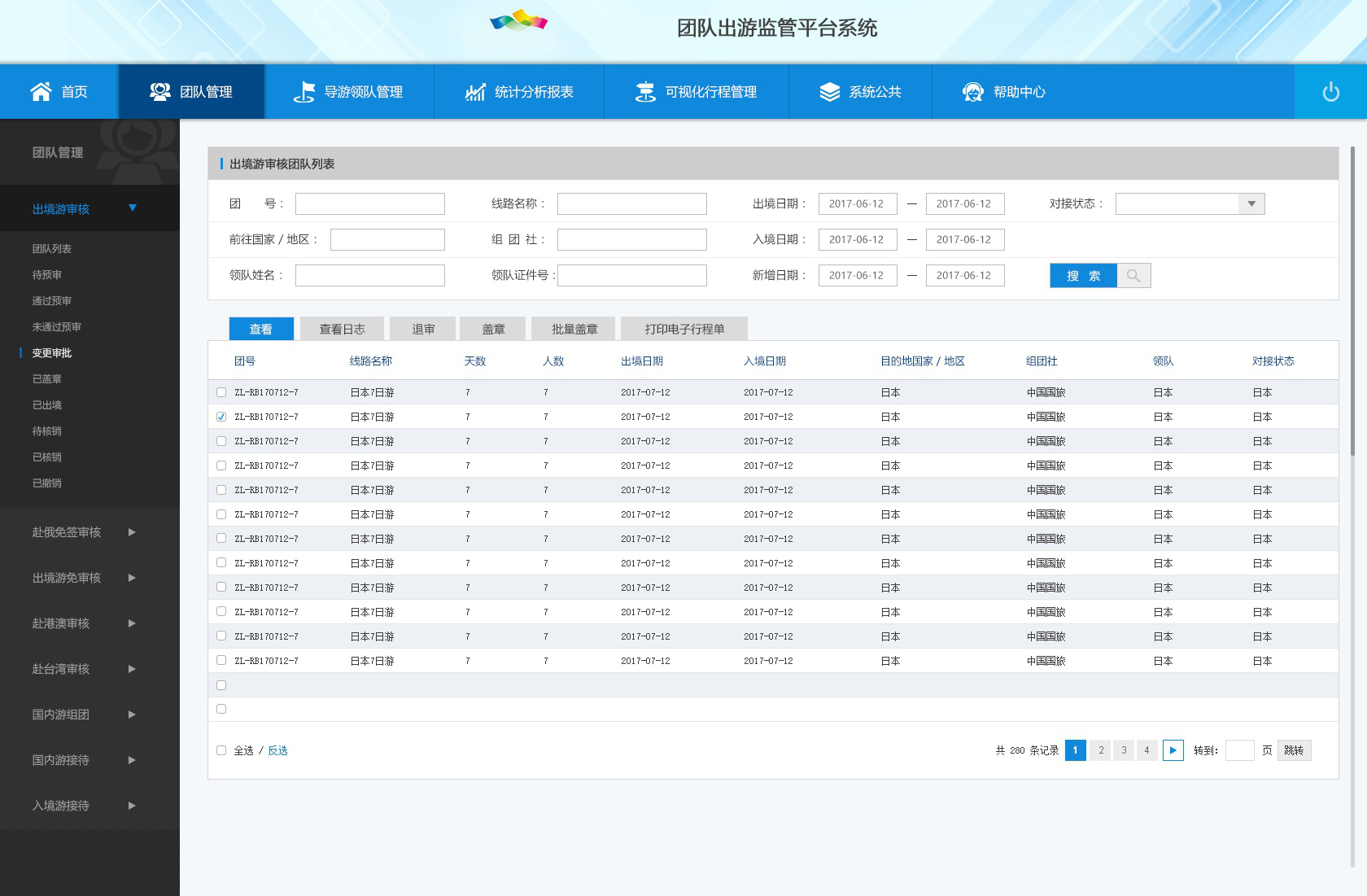 1) 團(tuán)隊(duì)管理:出境游審核、赴俄免簽審核、出境游免簽審核、赴港澳審核、赴臺(tái)灣審核、國(guó)內(nèi)游組團(tuán)、國(guó)內(nèi)游接待、入境游接待。