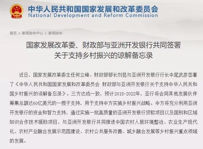亞洲開發銀行:國家發展改革委、財政部、亞洲開發銀行三方達成一致,預計 2018-2022 年,亞行將會同其他發展伙伴籌集總額達 60 億美元的一攬子支持,用于支持中方實施鄉村振興戰略。