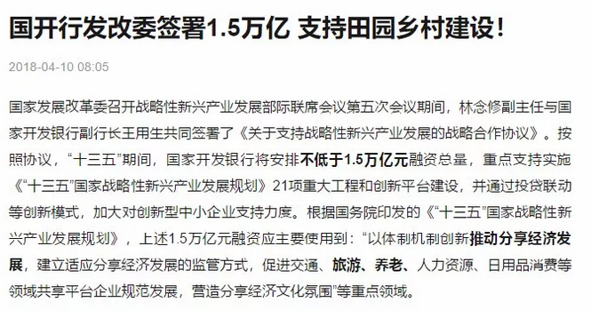國開行:國家開發銀行與發改委簽署 1.5 萬億協議,將用于農村康養產業建設。