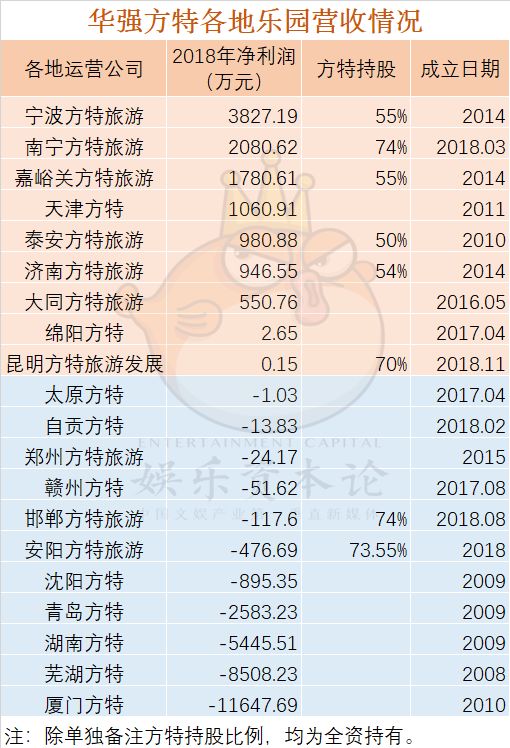 首先,華強方特位于各地的主題公園運營公司中,有一半左右處于虧損的狀態,其中廈門方特2018年虧損超1億元,蕪湖方特2018年虧損8500多萬元……
