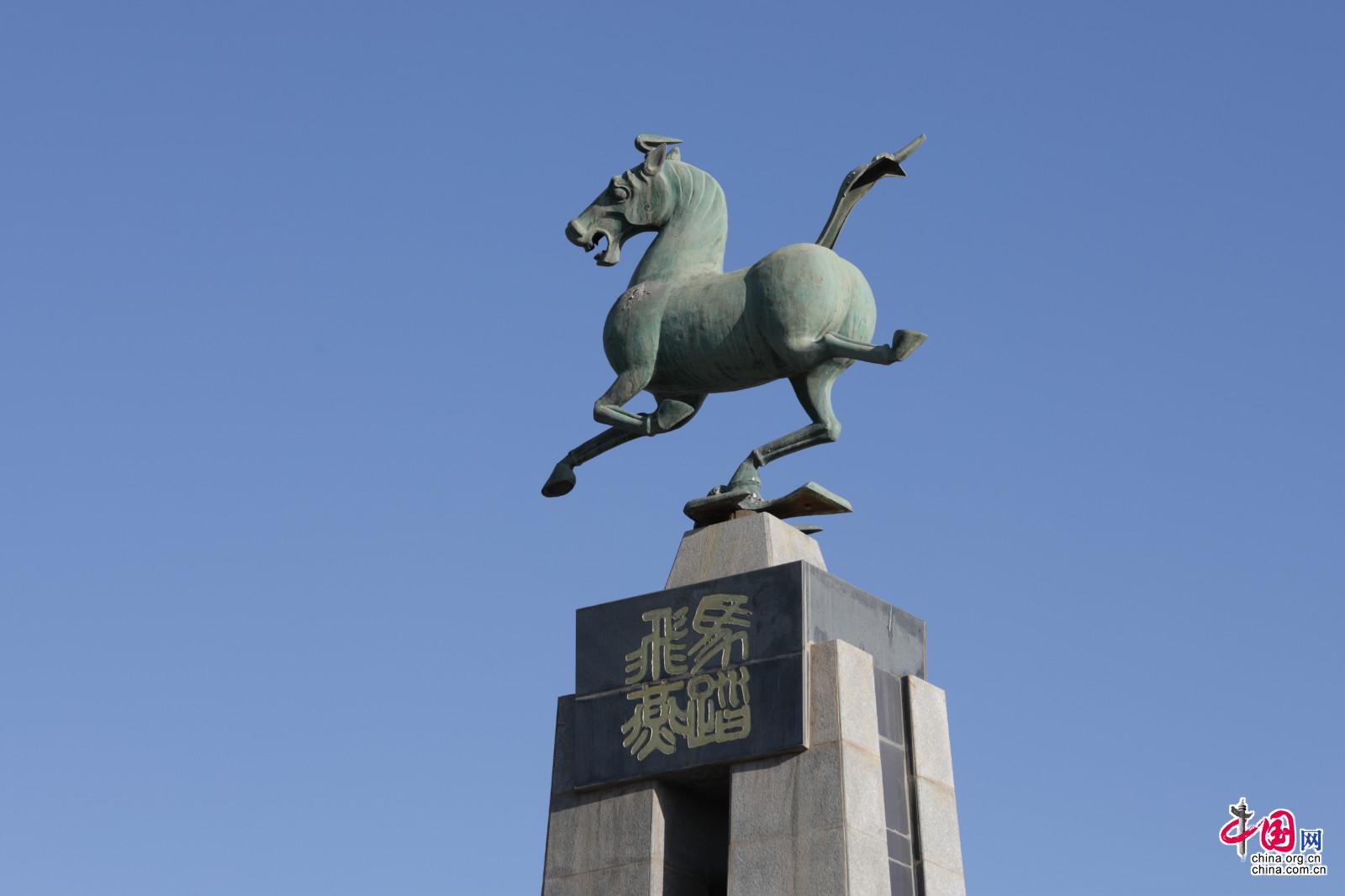 武威雷臺景區(qū)中國旅游標(biāo)志“馬踏飛燕”雕塑。中國網(wǎng)記者胡俊 攝