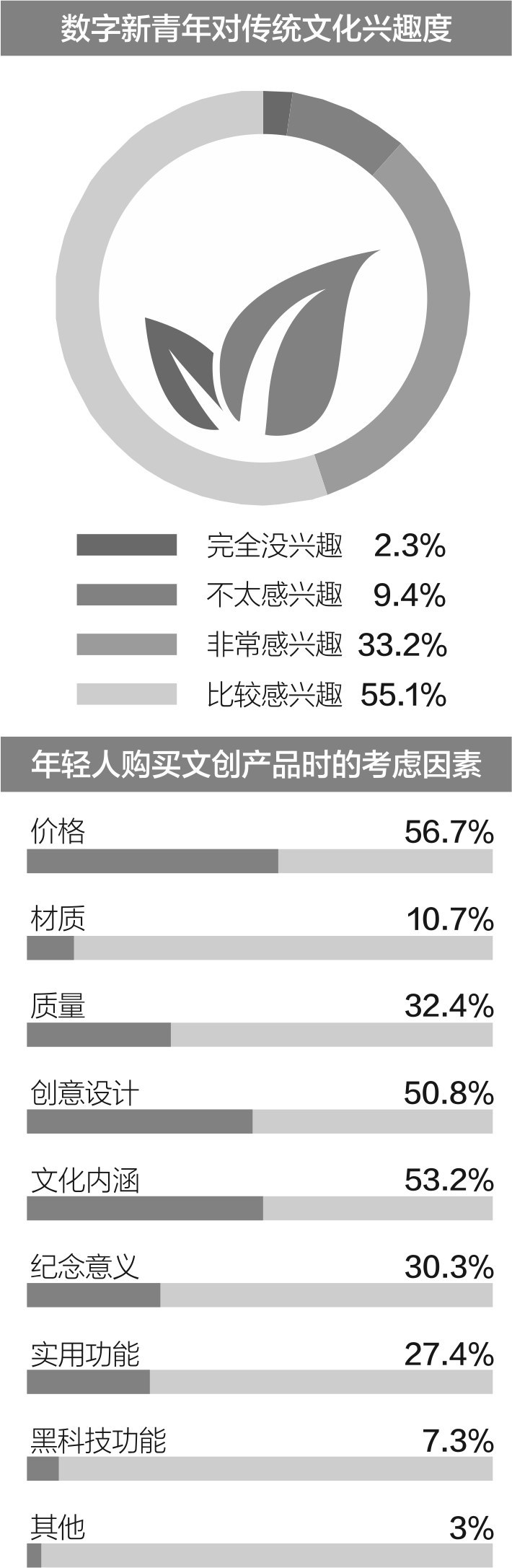 不過,當(dāng)下很多年輕人雖然愿意“為愛買單”、為傳統(tǒng)文化貢獻(xiàn)購買力,但在文創(chuàng)產(chǎn)品購買上,年輕人更加注重產(chǎn)品的文化內(nèi)涵、創(chuàng)意設(shè)計(jì)和實(shí)用性。數(shù)據(jù)顯示,56.7%的數(shù)字新青年們最看重的是價(jià)格因素。