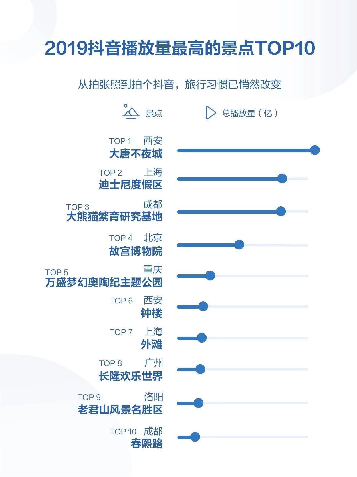 “打卡”,成為年輕人一種新的生活方式。比如23歲的抖音用戶@皮卡晨 化身“不倒翁小姐姐”,掀起握手狂潮,吸引人們爭(zhēng)相實(shí)地打卡。報(bào)告顯示,#大唐不夜城不倒翁#相關(guān)視頻播放量超23億次,西安大唐不夜城景點(diǎn)位列2019抖音播放量最高的景點(diǎn)首位,其次為上海迪士尼度假區(qū)和成都大熊貓繁育研究基地。