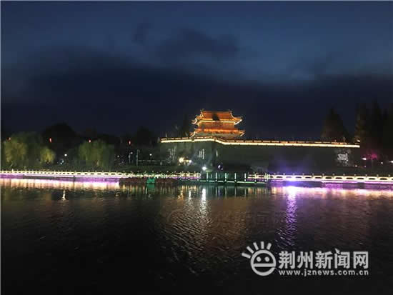 夜幕降臨,華燈初上,荊州古城賓陽樓披上五彩斑斕的“輕紗”,盡顯燈影交織下的絢麗多姿,古老的城墻散發出時尚耀眼的光芒。護城河畔,金鳳騰飛,燈火閃爍、游人如織,一步一景,人文氣息濃厚。一艘艘仿古畫舫穿梭在波光粼粼的護城河上,游客們乘船夜游,在習習涼風中感受著夜色下如詩如畫、美不勝收的古城夜景。來自武漢的游客楊榮一家四口趁著夜晚些許清涼出來游玩,感受和白天不一樣荊州古城。