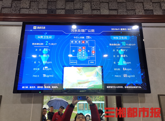 (4月11日,智慧廁所外的屏幕上顯示著蹲位占用情況等信息。記者 胡銳 攝)