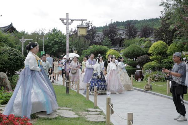 走進延吉中國朝鮮族民俗園,隨處可見身著朝鮮族服飾的游客,穿梭于青瓦白墻的院落里,抬眸揮手間皆是風景。在民俗園里當一天“公主”,在延吉網(wǎng)紅彈幕墻前,手持一杯印有“延吉”字樣的咖啡拍一張照片已經(jīng)成為一種時尚。